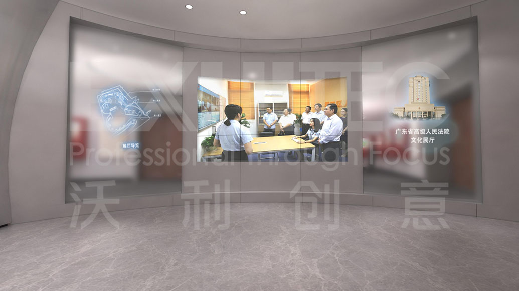 展馆全方位的展示了广东法院近70年来所取得的辉煌成果和宝贵的经验。展厅精心打造六大展区,三大高科技展项。通过弧幕影片呈现法院硕果,VR模拟法庭重现庭审精彩记录,DID实现数据大屏全面联动展现法院大数据,以创意结合高新技术体现智慧法院的建设,打造广东省首个法院数字化展览馆的标杆。